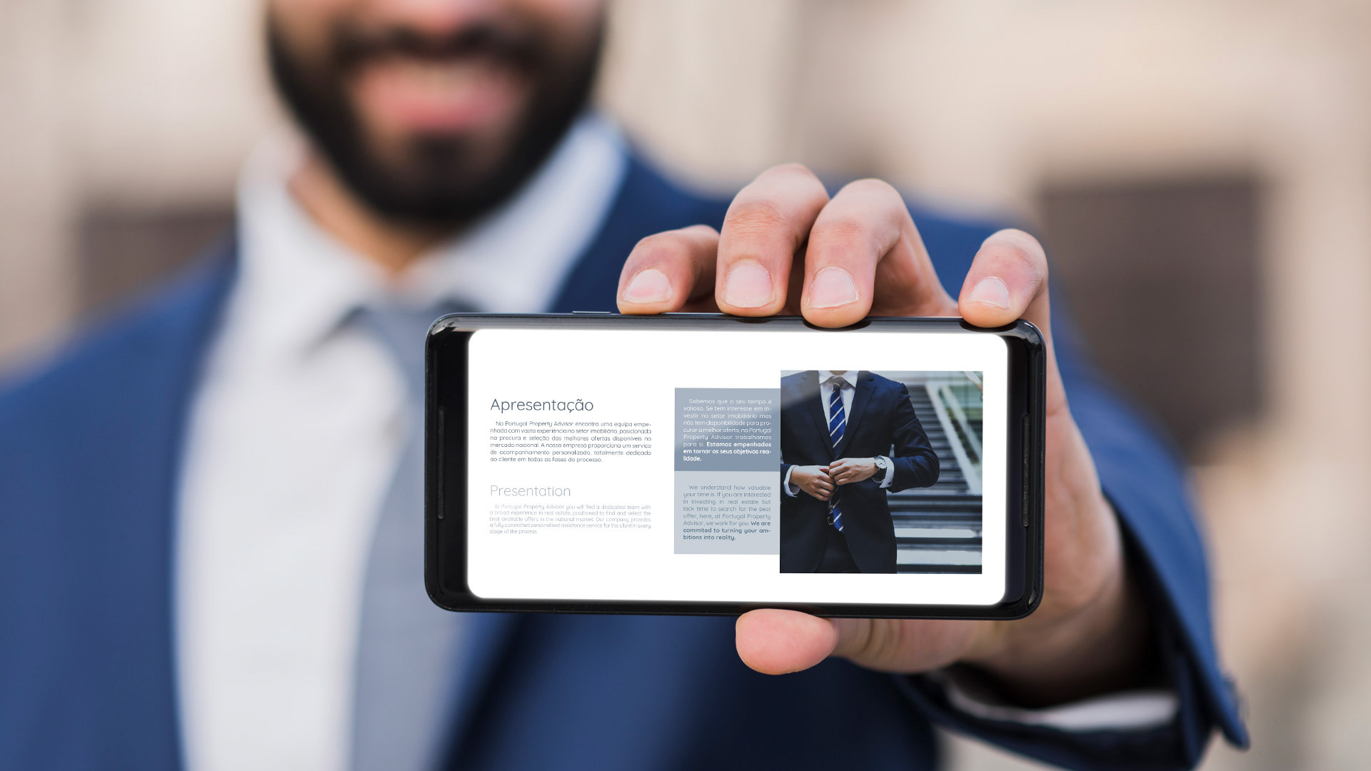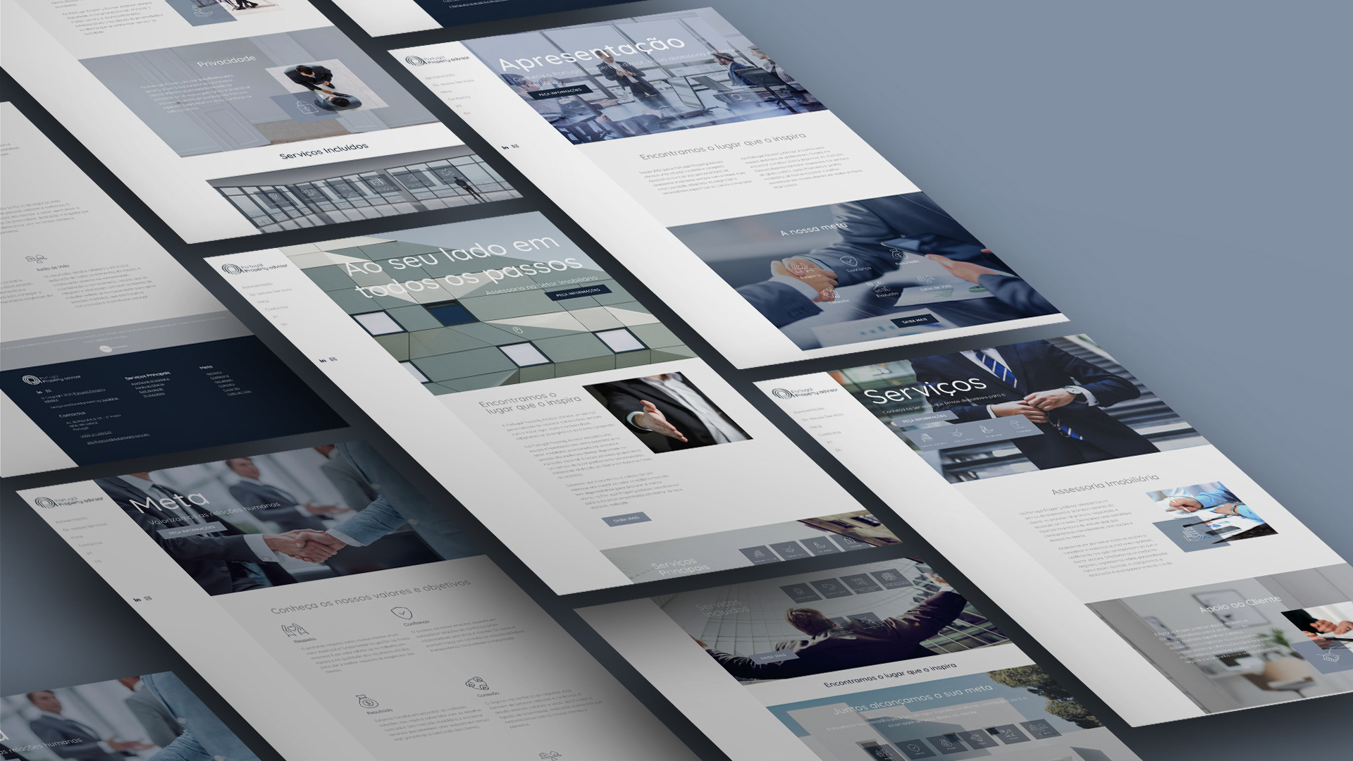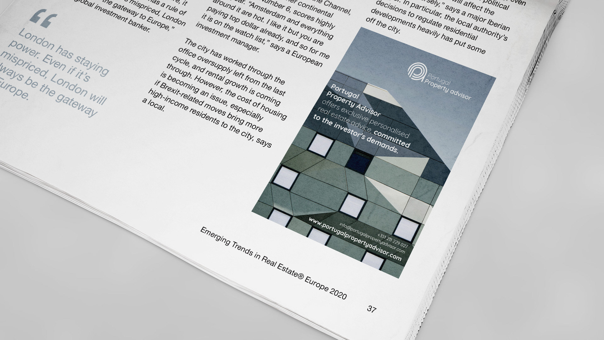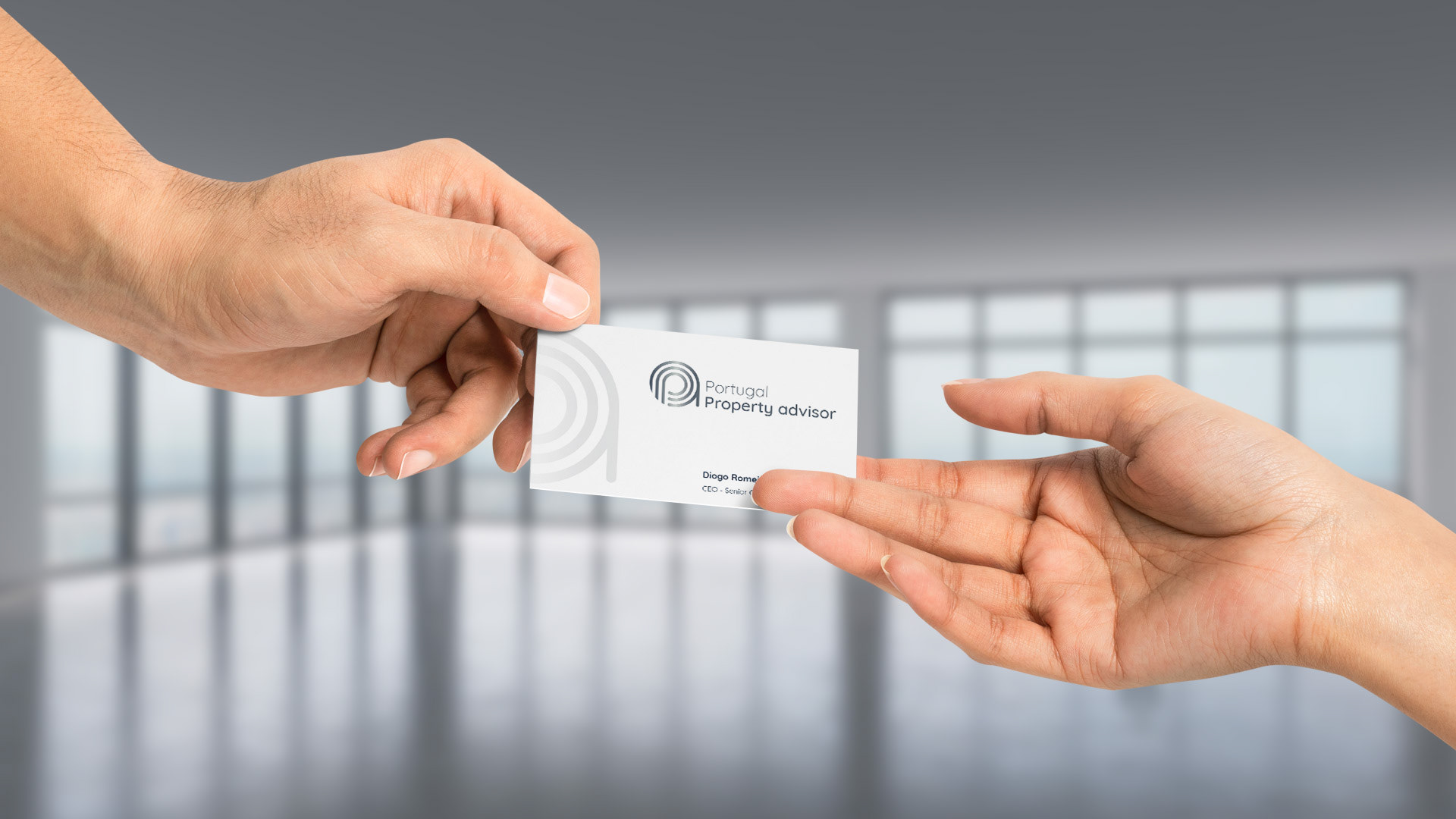 Brand, content, logo, website, brochure, and advertising for a Portuguese company specializing in real estate advice.